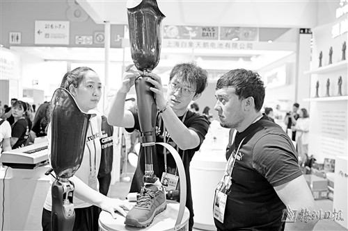 4月17日,外国采购商在强脑科技展台观看智能仿生脚。