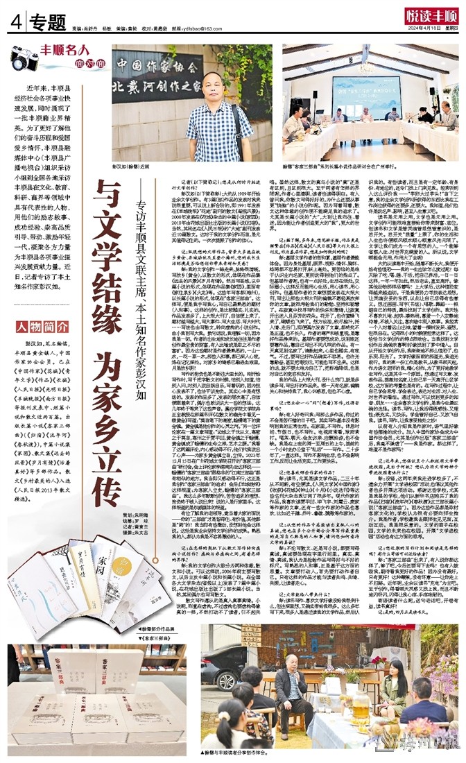 近年来,丰顺县经济社会各项事业快速发展,同时涌现了一批丰顺籍业界精英。为了更好了解他们的奋斗历程和爱国爱乡情怀,丰顺县融媒体中心(丰顺县广播电视台)组织采访小组到全国各地采访丰顺县在文化、教育、科研、商界等领域中具有代表性的人物,用他们的励志故事、成功经验、崇高品质引导、带动、激励年轻一代,凝聚各方力量为丰顺县各项事业振兴发展贡献力量。近日,记者专访了本土知名作家彭汉如。