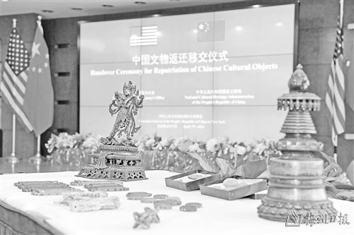 新华社纽约4月17日电 国家文物局17日在中国驻纽约总领事馆接收美国纽约曼哈顿区检察官办公室向中国返还的38件文物艺术品。
