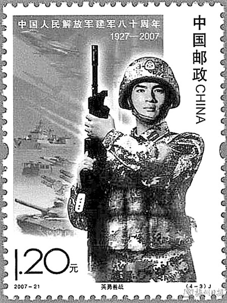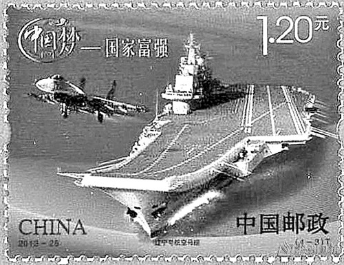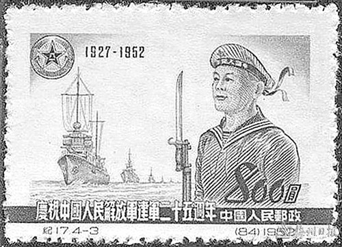1952年8月1日发行的《中国人民解放军建军二十五周年》纪念邮票的第三枚“海军”(图①),邮票颜色为青莲色,图案以一望无际的海洋和雄伟壮观的舰队为背景,塑造了一位英俊威武的海军战士形象;1955年7月16日发行的普8工农兵图案邮票,其中第九枚“海军战士”,图案为一位海军战士的半侧面头像;1965年8月1日,原邮电部发行的《中国人民解放军》特种邮票的第一枚,画面中有身着“六五式”军服,佩戴红五星帽徽和红领章的海军战士;1978年8月1日发行的《向硬骨头六连学习》特种邮票第三枚“苦练杀敌本领”,邮票画面中军舰破浪前行,端着冲锋枪的海军战士警惕地注视着前方;1987年8月1日发行的《中国人民解放军建军六十周年》纪念邮票第三枚“海军战士”,画面描绘了一名面向大海、高度警惕、精力集中的海军士兵形象,背景为浮出水面的潜水艇;1997年8月1日发行的《中国人民解放军建军七十周年》纪念邮票的第二枚“海军”,邮票主图是中国海军新型112号导弹驱逐舰劈波斩浪,勇往直前的画面。第五枚“陆海空联合演习”,图案以我军85新型水陆两栖坦克为主图,背景为陆海空和战略导弹部队协同作战的场面;1999年4月23日,中国邮政发行JP.76《中国人民解放军海军成立五十周年》纪念邮资明信片一枚。邮资图主图为遨游大洋的核潜艇,背景为水下运载火箭连续发射的镜头。片图主图为驱逐舰112舰,背景为乘风破浪的驱逐舰和护卫舰组成的海上联合编队及翱翔于碧海与蓝天之间的海军新型飞机;2007年8月1日,中国邮政发行《中国人民解放军建军80周年》纪念邮票的第三枚“英勇善战”(图②),邮票画面前景为身着新式海军迷彩作训服、手握钢枪的海军战士形象,背景表现海、陆、空、二炮协同作战的场景;2009年10月1日发行的《中华人民共和国成立六十周年国庆首都阅兵》纪念邮票的第三枚“海军装备方队” ,图案展现的是先进的海军岸舰导弹,背景为两栖突击车方阵;2013年9月29日发行的《中国梦—国家富强》特种邮票的第3枚“辽宁号航空母舰”(图③),邮票图案为我国海军第一艘可以搭载固定翼飞机的大型军舰,画面气势恢宏;2017年8月1日发行的《中国人民解放军建军九十周年》纪念邮票第二枚“海军”,图案为持枪的海军战士半身像;小型张“听党指挥”,邮票画面上军旗飘扬,其中有身穿藏青色英姿飒爽的人民海军形象。