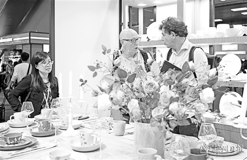 4月23日,境外采购商在家用餐具展台前洽谈。