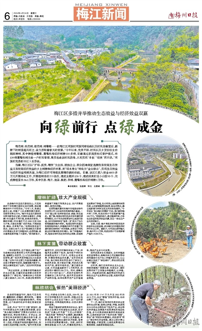 当前,梅江区以“扩绿、提质、增效”为主线,鼓励企业、群众因地制宜选种既有较高生态效益又有较高经济效益的乡土树种和经济林果,把“绿水青山”转化为“金山银山”,实现生态效益与经济效益同频共振,为梅江经济可持续发展增添新的动能。目前,该区已投入资金4800多万元开展绿化工作,开展植树活动270场次,建成主题林128个,建成绿美村庄小公园93个,完成种植苗木34.6万株,其中沉香、梅片、油茶、枇杷、李树、鹰嘴桃等经济树种5万株。