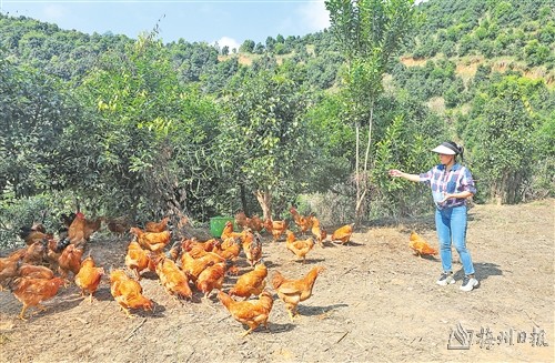 在西阳镇双黄村的梅州市桂冠生物科技有限公司1200亩的双梓南药梅片基地,一只只“跑山鸡”在树林里觅食、奔跑、相互追赶。据了解,桂冠生物科技多次到双黄村调研考察后,2014年决定租赁该村山地进行改造,当时的桉树林也“摇身一变”成为了如今郁郁葱葱的梅片树林。桂冠生物科技副总经理吴桂珍表示,种植梅片树不仅改善了双黄村原先桉树林广布的现象,还带动了村民就业和村集体经济的增长。除了种植梅片树,桂冠生物科技还依托林业资源,因地制宜发展林下养殖,充分利用土地资源和林荫优势,以及家禽能帮助除草、除虫的特点,建立起家禽与树林互促互利的良性循环。“今年结合‘我为梅江种棵树’行动,我们新种梅片树1万株,收成后预计可实现新增产值300万元。”吴桂珍表示,通过植绿护绿,力争生态效益和经济效益双赢,走出一条生态产业化的好路子。