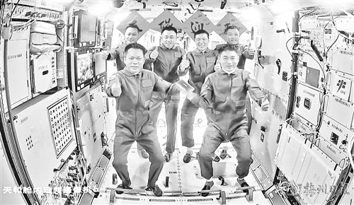 图为4月26日在北京航天飞行控制中心拍摄的神舟十七号航天员乘组和神舟十八号航天员乘组“全家福”。(新华社发)