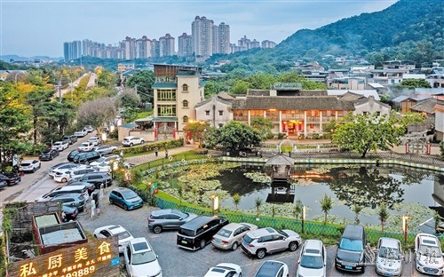 夜幕降临,位于梅江区三角镇泮坑村的又见·钧质楼民宿灯火通明,停车场基本停满,特色餐厅人气颇高。又见·钧质楼民宿毗邻客天下旅游风景区和泮坑旅游风景区,由80多年历史的客家围龙屋改造而成,既保留了客家风情,又有现代工艺韵味,因交通便利、设计独特而受到游客青睐。该民宿相关负责人告诉记者,假期前三天客流量每天200人左右,主要来自珠三角地区。