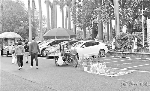 “这里有两个车位,前面的车主刚把车辆驶离。你买两串肉丸支持一下生意,我把车位腾空出来……”“五一”节当天,记者来到梅城剑英公园,刚走到公园门口停车场便听到一名流动摊贩询问过往车主是否需要停车。记者留意到,该名摊贩把三轮车、椅子等摆摊物品堆放在3个公共停车位前方,致使车主们无法将车辆停放进去(如图,朱绮辉摄),现场还有其他两名摊贩也是如此操作。走进公园,不少市民游客携亲带友散步游玩,畅享假期休闲时光。在和谐的景象中,有部分人坐在湖边的休闲长廊上赏景、聊天,双脚则直接踩在长廊座位上,还有小孩在座位上跑来跑去。