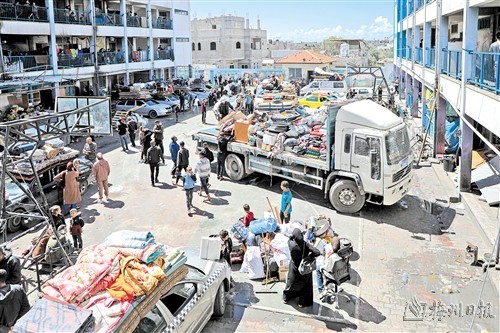 5月6日,巴勒斯坦人准备从加沙地带南部城市拉法一处由学校改建的避难所撤离。