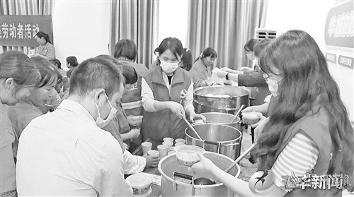在华城镇公用事业服务中心,华城镇机关党员干部分别为5名困难环卫工人送去慰问金。随后,全体环卫工人齐聚一堂,一同享用来自华城镇机关党员干部细心准备的姜枣茶、红豆薏米瘦肉粥、包子等暖心早餐,并送上爱心礼包。值得一提的是,此次活动的爱心礼包均是由爱心人士免费提供。