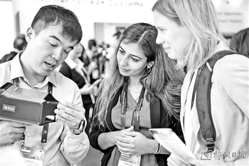 ▲5月8日,嘉宾在第六届全球AEO大会中国海关展台了解手持式再生金属分析仪。(新华社发)