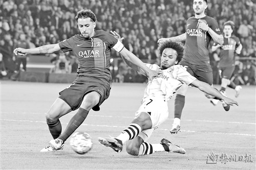 5月7日,巴黎圣日耳曼队球员马尔基尼奥斯(左)与多特蒙德队球员阿德耶米在比赛中拼抢。当日,在2023-2024赛季欧洲足球冠军联赛半决赛次回合比赛中,德甲多特蒙德队客场1比0战胜法甲巴黎圣日耳曼队,总比分2比0晋级决赛。(新华社发)