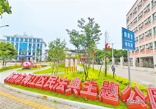 梅江区民法典主题公园(如上图,吴腾江摄)位于梅江区学富路,占地300平方米,融入客家“和”文化元素,围绕民法典总则、物权、婚姻家庭、侵权责任各编等相关内容,通过法治宣传栏等形式,多维度、立体化、全方位展示民法典知识,不仅成为市民经常“打卡”的休憩场所,也成为梅江区对外宣传的重要窗口之一。