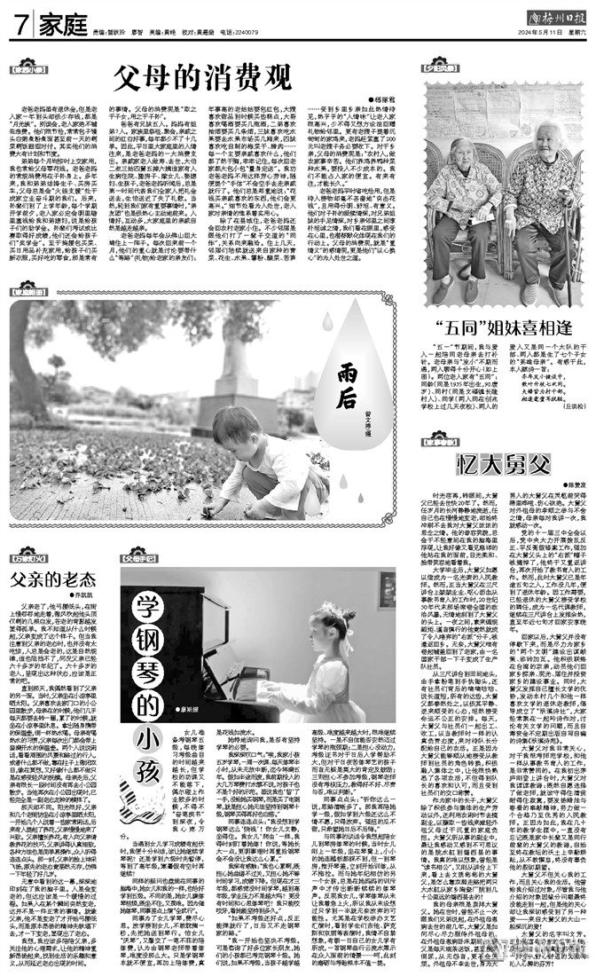 老爸老妈平时省吃俭用,但是待人接物却毫不吝啬地“突击花钱”,且用得分明、舒坦、有意义。他们对子孙的舐犊情深,对兄弟姐妹的手足情深,对乡亲邻里之间淳朴坦诚之情,我们看在眼里,感受在心里,也潜移默化体现在我们的行动上。父母的消费观,就是“重情义”的感情观,更是他们“以心换心”的为人处世之道。