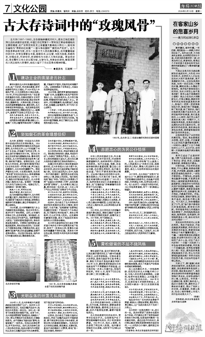 古大存(1897-1966),五华县梅林镇优河村人,是东江地区继彭湃之后的卓越农运先驱,中国工农红军第十一军和东江革命根据地的主要创建者,在广东军史和党史上有着重大影响的人物之一,被毛泽东誉称为“带刺的红玫瑰”“一面斗争的旗帜”“模范共产党员”。古大存投身革命即为家,戎马一生致力于人民的解放事业,在风餐露宿昼伏夜行中,时常住草寮当书斋,细读兵书,以石壁、木炭为纸笔,有感而发,妙笔生花,吟诗作对,把诗歌作为与敌人斗争的武器。革命成功后,常在繁忙工作之余以笔为犁,以梦为马,用革命的诗词,彰显深厚的人民立场和人民情怀,给后人留下了无比宝贵的精神财富。