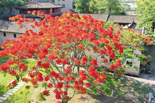近日,记者在东山书院等地看到,高大粗壮的凤凰木自然舒展,一树树凤凰花如烈火般绽放,花瓣又红又大,一团一团地裹起来,像“火凤凰”的羽毛,成为夏日一道别致的风景。