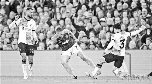 当日,在英国伯明翰进行的2023-2024赛季英超联赛第37轮的一场比赛中,利物浦队客场以3比3战平阿斯顿维拉队。(新华社发)