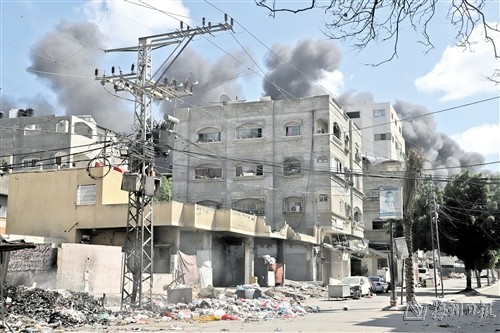 图为5月13日,在加沙地带北部杰巴利耶难民营,以军轰炸后升起浓烟。(新华社发)