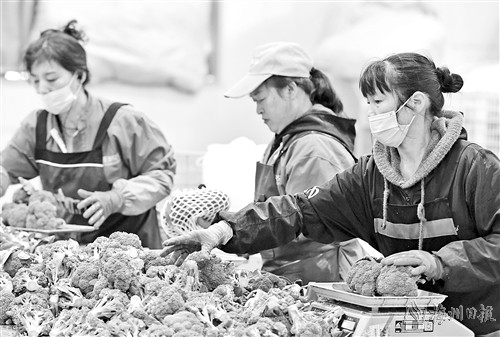 5月15日,在福州市长乐区雪美农业蔬菜基地,工作人员把绿色蔬菜挑选、打包称重,发往电商平台和超市销售。