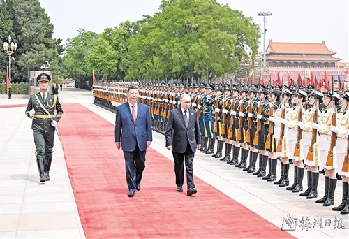 会谈前,习近平在人民大会堂东门外广场为普京举行隆重欢迎仪式。