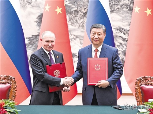 普京表示,俄中两国政府间合作机制运作良好,两国经贸、农业、工业、能源、互联互通等领域合作稳步发展。俄中关系的建立和发展,基于睦邻友好、相互尊重、助力各自国家发展等原则,经受住了各种考验。今天双方签署系列合作文件,表明双方继续深化拓展互利合作的决心。俄方愿同中方落实好《2030年前俄中经济合作规划》,办好今明年“俄中文化年”活动,加强欧亚经济联盟同共建“一带一路”倡议对接。明年将迎来世界反法西斯战争胜利80周年,俄中双方将举行庆祝活动。俄方赞赏中方在重大国际地区事务中秉持客观公正立场,愿同中方继续密切战略协作,坚定相互支持,促进世界多极化和国际关系民主化进程,推动俄中全面战略协作伙伴关系取得更多成果。