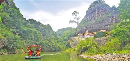 到达时已近中午,简单的午餐过后,我们先是乘坐竹筏游了紫云河。紫云河是个充满诗情画意的地方。这里水皆漂碧,浅处游鱼细石,直视无阻;深处潮平岸阔,静水深流。河两岸竹树翠蔓,蒙络摇缀。竹筏先是经过西岩广缘寺下的水湾。乘着竹筏,穿梭于丹山碧水、森林湖泊之中,两岸丹崖奇观、紫竹葱郁,美不胜收。在导游的介绍下,紫云第一“山”、蜡烛峰、官帽山、广缘寺、紫竹林、象猴山等自然人文美景一一呈现在眼前。导游告诉我们,紫竹林中栖居着灰鹭,可遗憾的是我们来回并没有看到。