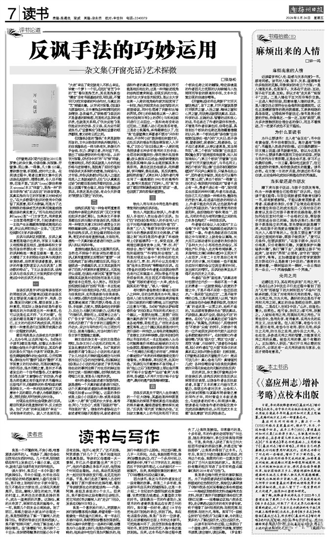 作者在“自序”里坦承:“讲真话有时也要付出代价……我却不是一个真正的勇者……这就使我陷入极度的矛盾之中,于是不得不采取一些迂回战术。”一是采取“远攻近交”,二是不做早啼的公鸡,三是不轻易授人以柄,“我的上述做法也许会被勇者所耻笑,但我对‘真’的追求是一以贯之的,始终不渝的。”此话颇有季羡林先生“要说真话,不讲假话,真话不全说,假话全不说”的意味。在《论“认认真真走过场”》里作者承认:“我属兔,历来胆小”,即使举例也“不敢举‘尖端’的例子,只敢举个我的一位外地朋友讲的年代较久远的安全系数较高的例子”。在封底勒口作者曾自嘲:“厌恶‘假大空’,常说‘空大假’;思想‘先锋’,行动保守。”读者也许会疑惑,胆小的作者在“空大假”和杂文的求真求实之间如何弥合差距?归根到底,《开窗亮话》里的天窗能开几分?亮话可说几许?真心会有几何?真情堪托几成?各种自嘲自省与自我批判最终或许只得无奈地走向无解的总体反讽!