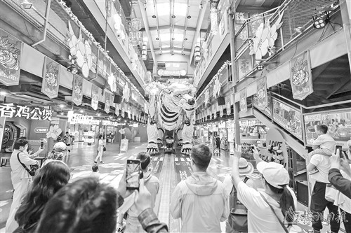 图为游客在辽宁省大连市熊洞街观看仿生机械巨熊表演。(新华社发)