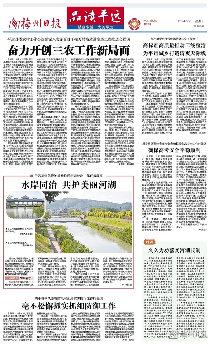 本报讯 5月23日晚,平远县委书记、县长周小勇主持召开县“百千万工程”“三线”整治工作推进会,强调要深入学习贯彻习近平总书记关于城乡融合发展的重要论述,认真落实省委、市委农村工作会议暨深入实施“百千万工程”推进会精神,围绕“三线”整治主要目标任务,加强统筹协调,压实工作责任,高标准高质量推动“三线”整治工作。平远县委副书记陈秋文,县委常委、副县长韩旭参加会议。