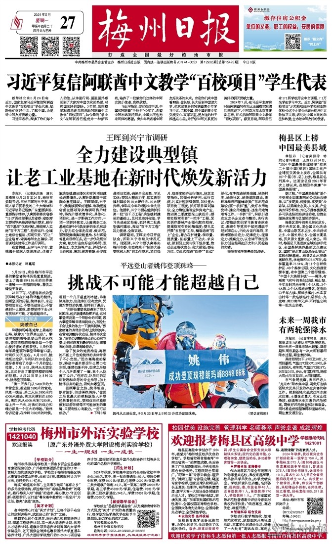 5月22日,来自梅州市平远县的攀登者姚伟历经重重挑战,登上了海拔8848.86米的世界第一高峰——珠穆朗玛峰,喜悦之情溢于言表。