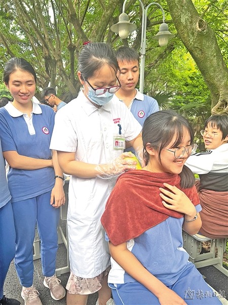 在义诊活动中,广州中医药大学梅州医院组织治未病科、妇科、肺病科、耳鼻咽喉科、脾胃病科、皮肤科等科室14名专家来到东山中学,不仅为高三学子们开展健康教育讲座,还给学子们讲解针灸穴位辨识,中西医结合调理睡眠及经期保健理念,根据备考学子们的身体情况提供了饮食、运动及生活上的健康指导。