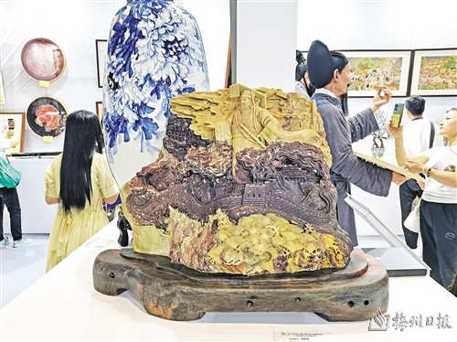参展期间,我市选送的作品——蒋向华创作的石雕《天下》获“中国工艺美术文化创意大赛”银奖。据介绍,该作品原材料使用的是梅州本地的叶蜡石,长80厘米、宽23厘米、高57厘米。“我在青黑双色叶蜡石上进行创作,雕刻出千古一帝立于长城之上的形象,用时半年左右。”蒋向华介绍说,该作品有古今时空转换之意,既有宫殿车马,也有火箭航母,体现出华夏文明繁荣昌盛。