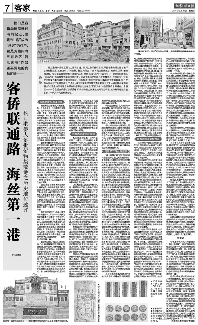 经千年孕育,松口已成为客家人文资源富聚地。如今走进松口,联合国教科文组织确立的中国唯一的纪念项目“中国移民纪念广场”,中国历史文化名镇、中国历史文化名街、中国华侨国际文化交流基地、中国传统村落等一块块“金字招牌”,让这座城镇处处浸润着历史厚重感。南方海上丝绸之路是人类文明进程中一个重要里程碑,不论是过去还是现在,海洋经济对促进梅州发展都有重要意义。当前梅州应充分利用国家“一带一路”的战略决策,争取项目,扩大招商,吸引广大海外华侨、华人来梅投资兴业,助推梅州振兴发展,让梅州在21世纪海上丝绸之路的建设中再创辉煌,谱写新的历史篇章。