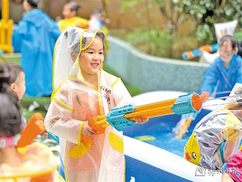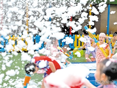 本报讯 无嬉水,不夏天。5月30日至31日,梅县区正本大地幼儿园为幼儿们精心准备了“泡沫嘉年华”六一儿童节活动,孩子们穿着五彩斑斓的泳衣,头戴炫酷泳镜,手拿霸气水枪,在泡沫海洋里尽情欢笑、追逐、打闹,进行了一场酣畅淋漓的泡泡大战。