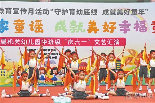 本报讯 5月29日至31日,梅州市直属机关幼儿园处处笑语欢歌,热闹非凡,小、中、大班的幼儿们和老师、家长们在园内参与了一场别开生面的“庆六一”活动。活动以“唱响红色客家童谣 成就美好幸福童年”为主题,旨在培养幼儿们的艺术兴趣、创造力、团队合作能力、自信心及表现力,积极传承和弘扬客家文化,引导幼儿从小听党话、感党恩、跟党走,培养幼儿爱党爱国爱家乡的情怀。