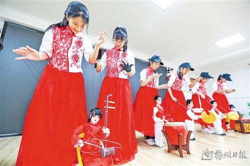 “身体跟着乐曲的节奏提线,再让木偶生动一点。”五华县第一小学活动教室内,老师在一旁看着并不停地叮嘱着。学生们正排练五华提线木偶剧《王二小》《童狮献瑞》等剧目。没有生命的提线木偶,在学生们手指的灵活操作下变得“活灵活现”,各种动作生动传神。五华提线木偶是极为宝贵的传统艺术,艺术特点别具一格,自成体系,木偶道具制作精巧。但木偶戏艺人传承难度大、时间长。经过历代艺人的苦练精传,这门艺术才得以推广发展。五华提线木偶剧进入校园,也为孩子们提供了经典特色的艺术课程。孩子们在这里获得了与传承人对话交流的机会,感受到了非遗文化的绚烂和韵味。