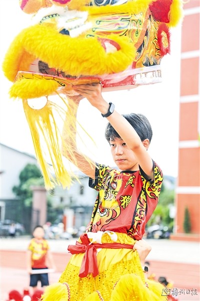 五华县黄狮小学,学生们利用课后时间练习醒狮。学生们个头不大,但目光和动作干净利落。7斤重的狮头,在孩子们手里随着激昂的鼓点起落,时而三抛狮,时而三拜狮。醒狮的精气神,也在少年们一个个动作中熠熠生辉。被托举腾起,双脚稳稳地落在高点,醒狮的欢腾和灵动,很大程度来自于其动作幅度之大。而这样的动作幅度,考验着孩子们的身手和勇毅,是千百次的训练和坚持铸就了下脚一瞬的稳定。