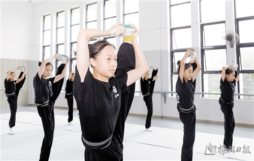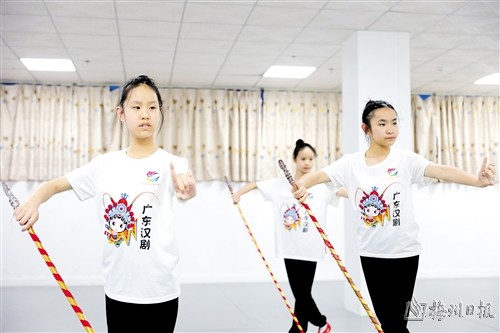 豆大的汗水从额头流下眉心,双手紧紧压实高举的腿,保持1分钟岿然不动,这是梅州市艺术学校客家山歌剧幼苗班的孩子们在练习朝天蹬。清晨5点半,她们就开始了一天的训练:腿功、毯子功、身段课、把子课、唱腔课……汗水浸润了每个学员稚气的脸庞,生动诠释了“台上一分钟,台下十年功”的含义。山歌剧幼苗班的孩子们还需要这么扎实的戏剧表演基本功?是的。艺术的传承绝非单一的修炼,唱腔、舞蹈、基本功训练以及客家民俗文化知识,一样都不能落下。