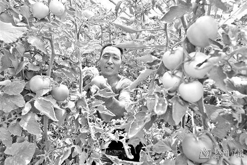 6月3日,农民在河北省盐山县盐山镇一处果蔬种植棚内采摘西红柿。