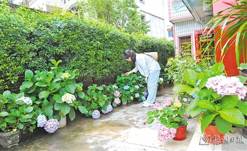 新铺镇同福村村民赖碧珍是远近闻名的种花能手,家里种了三四十种花卉。现在正值绣球花期,庭院里开满了蓝色、粉色、紫色的绣球,还有水梅花、球兰、灯笼花、蓝雪花等,五颜六色的花卉装点着这个小小的庭院。“我平时的爱好就是种花,陶冶心情又能美丽庭院,一举两得!”赖碧珍说。
