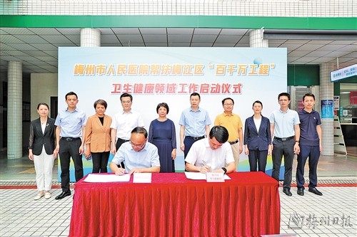 本报讯 5月29日下午,梅州市人民医院帮扶梅江区“百千万工程”卫生健康领域工作启动仪式在梅江区城北镇卫生院举行。梅江区人民政府党组成员、副区长丘颂霞,梅州市人民医院党委书记、院长钟志雄等医院领导班子成员、相关职能科室负责人及50名帮扶专家,梅江区卫生健康局党组书记、局长廖乾金等区卫健局领导班子成员,相关基层医疗卫生单位主要负责人等参加活动。