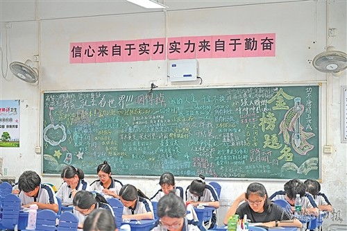 清晨7时许,步履匆匆的高三年级学子陆续踏进教室。一沓沓复习资料整齐堆放在走廊里,墙面上张贴着作文范文、时事热点、常用解题技巧等。教室里,学生们伏案自习,专心致志。他们有的在课桌上张贴了手写的励志卡片,有的则通过手表、时钟时刻提醒自己要争分夺秒,勇战夺魁。