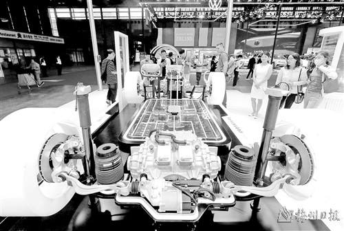 6月6日,参观者在上汽集团绿云纯电专属系列化平台展示模型前驻足观看。