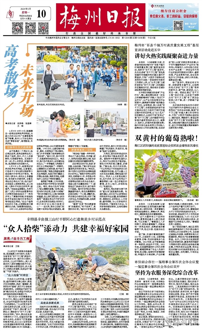 18时15分,生物学科目考试结束铃声响起,2024年夏季高考落幕。17时30分,记者在梅州城区、蕉岭、丰顺等多个考点看到,校门外早早围聚了前来接考生的“亲友团”。“高中三年,孩子辛苦了,也能感觉到他的压力。考试时,我们也不敢多问,生怕增加他的压力。”一早带着家人来接孩子的江女士特地准备了一束鲜花,以满满的仪式感和爱,给予孩子美好的祝愿。“我提过希望他高考后去考驾照,他表示想打暑期工开展社会实践,我都支持他,祝愿他开心过好这个特别的暑假。”
