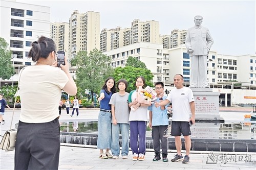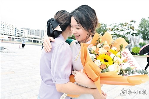 6月9日上午,地理考试结束的铃声尚未响起,记者看到,已经有不少学生家长拖家带口地在梅州中学考点外等待。等待的人群当中,有的女士身着旗袍,有的家长手捧花束,当看见考生走出考点大门后,他们迫不及待地迎上前拥抱考生,送上祝福,人群中不时发出欢呼声、鼓掌声。“祝姐姐金榜题名,未来可期!”人民小学学生徐紫珊用自己的零花钱给姐姐买了一束花并写上了真挚的祝福,和爸爸妈妈早早地到达梅州中学考点外等待姐姐出考场。“在这个值得纪念的日子里,必须要给孩子满满的仪式感。”徐紫珊的妈妈说。