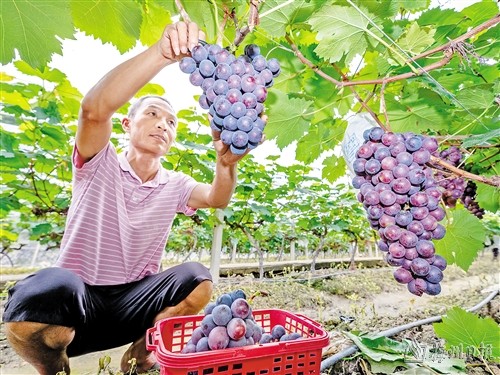本报讯 (记者张莹娜)记者日前来到梅江区西阳镇双黄村葡萄园,映入眼帘的是一串串葡萄沉甸甸地挂满枝头,鲜嫩水灵、果粒硕大,满园都是淡淡的葡萄清香。