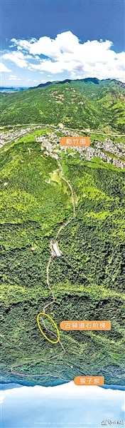 猴子岽古驿道,南从北斗起,北到建桥青潭止,全长约30里路,南面稍缓北坡陡峭。崎岖不平处铺筑一级级青石板,缓坡处则是泥土路。而今,猴子岽两侧断断续续遗存有十几处上百级石阶,每级石阶约3尺长,路人上下可逆向而行。