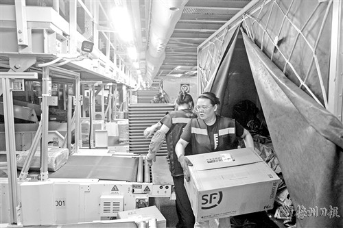 近日,工人在鄂州花湖国际机场转运中心进行分拣作业。