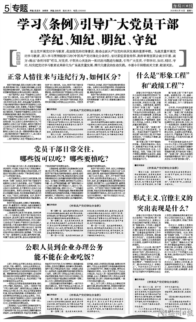 在全党开展党纪学习教育,是加强党的纪律建设、推动全面从严治党向纵深发展的重要举措。为高质量开展党纪学习教育,深入学习贯彻新修订的《中国共产党纪律处分条例》,省纪委监委宣传部、案件审理室联合南方日报、南方+推出“条例问答”栏目,对党员、干部关心关注的一批纪法问题进行解读,引导广大党员、干部学纪、知纪、明纪、守纪,切实把党纪学习教育成果转化为广东高质量发展、现代化建设的生动实践。本报今日转载相关文章,敬请关注。