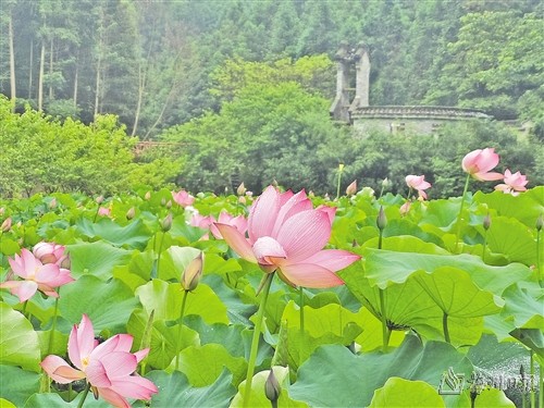 汽车刚拐入村口,就见一大片荷花亭亭玉立,在阳光的照射下,波光粼粼的水面闪着点点金光,荷叶如盖,荷花楚楚动人、婀娜多姿,显得格外美丽。映衬得近旁那原生态草垛、水车、古色古香的游客服务中心等设施更增添了几分魅力。沿着村道往前走,到达田园巴厘景区,荷花开得愈发茂盛,木质栈道如同浮桥般镶嵌其间,别有一番风味。偶尔有几只蜂蝶飞来,在花叶间蹁跹起舞。六月的天,犹如小孩面,说变就变。就在我们欣赏荷花时,突然下起了一场大雨。雨水过后,走进荷花田,它们姿态各异,有的含苞待放;有的才露出两三片花瓣;有的花瓣全都展开了,露出嫩黄色的小莲蓬,温柔的微风轻轻拂过,荷叶上的露珠随风滚动,袅袅荷香弥漫在荷塘上空,令人心旷神怡。周边田园屋舍俨然,远处青山含黛,让人仿佛置身于一幅优美恬静的山水画卷之中。