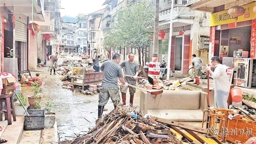 “水退一点,我们就前进一点,尽快恢复道路通畅。”17日下午,蕉岭县广福镇部分路段洪水退去,镇村干部马上开展清淤工作。