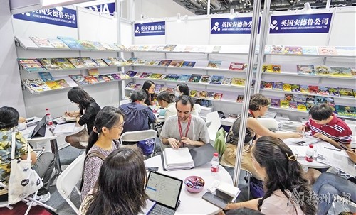 6月19日,中外出版商在博览会上洽谈业务。